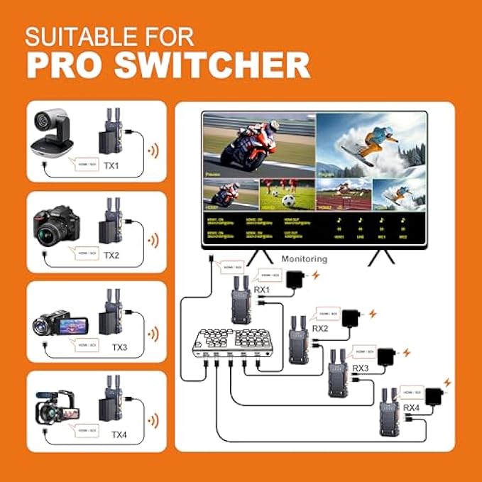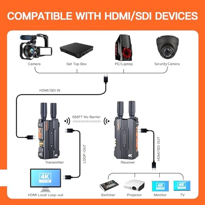 • 【Support 1 TX up to 4 RX】1 wireless HDMI transmitter support wireless connect Max 4 receivers at the same time.You can combine and match them to suit your needs,such as 1 TX to 2 RX, 1 TX to 3 RX, 1TX to 4RX(Max). The receiver can support simultaneous output of HDMI and SDI video signals,so it allows you to connect up to 8 monitors at the same time. Note:When the number of receivers increases,the video transmission distance will be shortened.