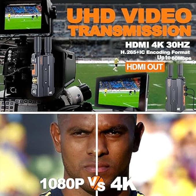• 【4K UHD Wireless Video Transmission】ChwFio WL098 4K wireless HDMI transmitter and receiver HDMI port support video input/output formats up to 4K@30Hz 3840x2160P, SDI port support video input/output formats up to 1080P@60Hz 1920*1080P. Wireless HDMI transmitter receiver utilizes the latest H.265(+IC hard decoding) video encoding technology,the bit rates can up to 60Mbps,it can transmit video signals over longer distances with lower latency and with less loss of video picture quality.