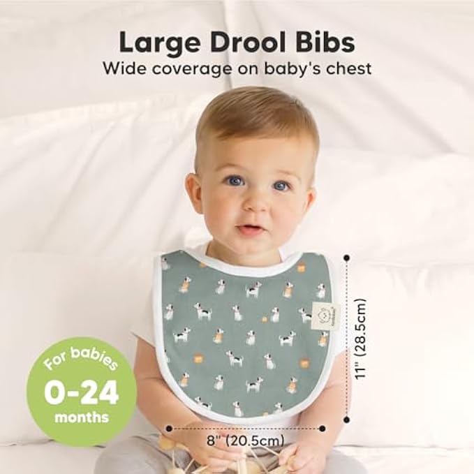 • Super Absorbent - Our organic baby boy and girl bibs are made with 100% organic cotton (GOTS-certified) and backed with water resistant fleece for added absorption. This dual layer design helps to keep your baby clean and fresh all day long. Suitable for newborns, infants, toddlers, heavy droolers and teething babies.