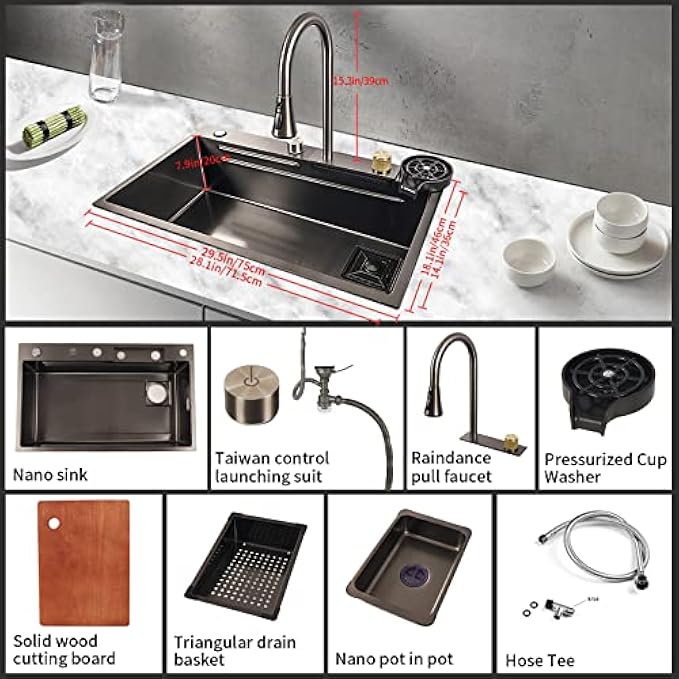 • HIGH-QUALITY MATERIAL:This waterfall kitchen sink is newly released to the market. It is made of high-quality 304-grade stainless steel for excellent hardness and durability. The kitchen sinks adopt nano-coating finish, which is anti-rust, durable and long-lasting. Wipe clean for easy maintenance.