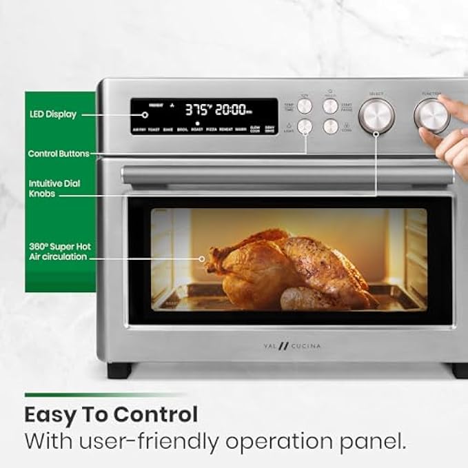 [INFRARED HEATING + TRUE CONVECTION AIR FRY] Our cutting-edge technology features a powerful and effective heat radiation system, coupled with a high-velocity heated-air circulation, which results in a quick and deliciously flavorful brown crust while preventing food from becoming overcooked or dried out. It ensures that the interior of food remains tender and juicy, stays succulent and moist up to 35%, providing a perfect balance of texture and taste. [SUPER VERSATILE “10-in-1” AIR FRYER CONVECTION TOASTER OVEN] Unlike typical air fryer or oven with a single function, we take it up a notch by offering 10 preset digital functions that include Air Fry, Toast, Bake, Broil, Roast, Reheat, Warm, Slow Cook, and Dehydrate. This versatile 10-in-1 combination allows you to prepare a variety of dishes with ease and convenience, making your cooking experience more enjoyable than ever before. [FAMILY & PARTY SIZE CAPACITY] VAL CUCINA stands out on the market with a 30%-60% larger capacity. You can easily roast a 5-6lb chicken, toast 6 slices of bread, cook a large batch of French fries, 20 chicken wings, or bake a 12-inch pizza, all in one go. This larger capacity is perfect for families, entertaining, or meal prepping, making it a versatile and essential addition to any kitchen. [CRUNCHY and HEALTHY COOKING EXPERIENCE]Our Air Fry feature is a healthier alternative to traditional frying, reducing fat by up to 75%. Enjoy all your favorite foods guilt-free, including deep-fried favorites like fries. With intensive and efficient infrared heating combined with true convection, our air fryer toaster oven delivers perfectly crispy and golden results every time. This delivers an exquisite blend of texture and flavor, ensuring a superb culinary experience. [FAST, SAFE & EASY to USE] With 1750W of power and six heating elements, the VAL CUCINA Air Fryer toaster oven cooks 40% faster than traditional ovens. The even distribution of heat reduces preheating time by up to 30%, saving your valuable time in the kitchen. Our user-friendly digital display and analogue controls make cooking effortless and enjoyable. VAL CUCINA countertop oven boasts a variety of accessories: an Enamel Baking Tray, Wire Rack, Air Fryer Basket, Crumb Tray.