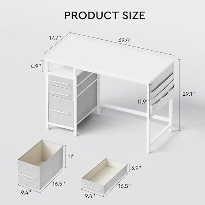 Maihail Maihail Small Desk with Drawers, 40 inch Computer Desk with Shelves, Writing Desk with Storage, Small Office Desk with Metal Frame, White