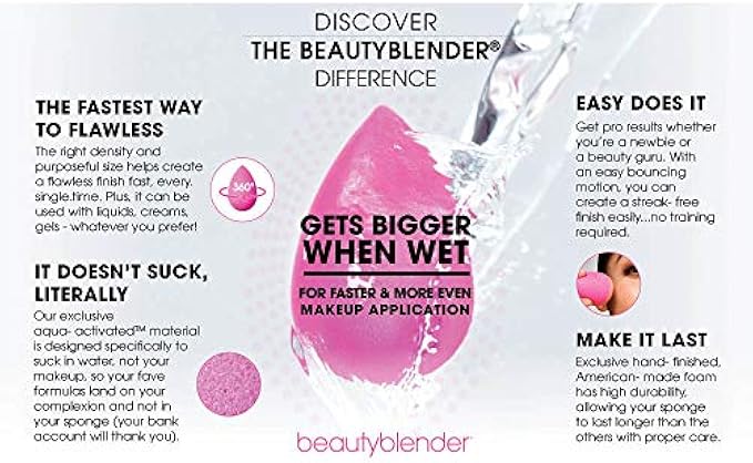 • Smooth Blend: The award winning aqua-activated sponge grows to about twice its size when wet, and absorbs minimal product so your formula lands on your complexion and not your sponge. bounce and blend the soft sponge to a smooth finish.