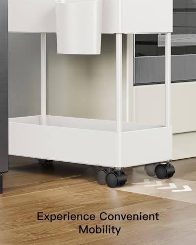 MAKE THE MOST OF YOUR SPACE: This slim rolling cart is a great way to organize small spaces. Make clever use of the gap between toilet and sink, washer and dryer, or refrigerator and counter with this slim storage cart. Small rolling cart will maximize space and add function. CUPS & HOOKS FOR EASY ACCESS: The storage cart includes 1 cup and 4 hooks to hang on the side of storage cart for quick access. This bathroom cart rolling cart also works well in the closet, kitchen, garage, laundry room, the office, and more. SPACE-SAVING SHELVES: This bathroom organizer can provide extra storage for limited spaces if you need to store cleaning supplies in the kitchen or use the bathroom cart storage cart as bathroom storage for toiletries, towels, or cosmetics. CONVENIENT MOBILITY: The rolling cart has durable caster wheels that allow you to roll the slim rolling cart smoothly in and out of tight spaces. The wheels of storage cart can be removed to use this small rolling cart as a kitchen organizer under the sink. STURDY DESIGN: The small rolling cart is made of high-quality ABS material with ventilation holes to allow drainage and air movement. This rolling cart storage cart is especially helpful for laundry room storage, bathroom storage and other wet storage locations.