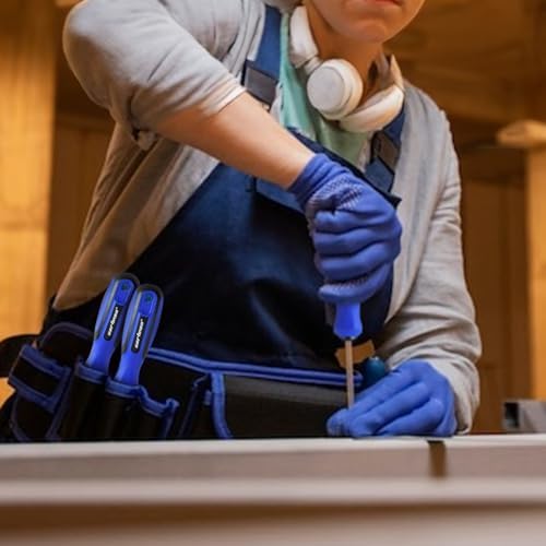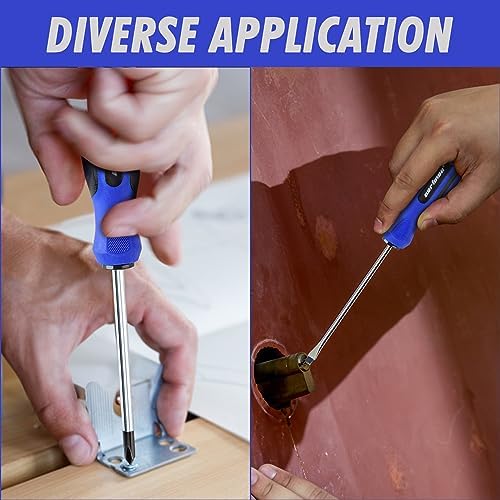 Made of heat-treated CR-V steel for enhanced sturdiness, rust resistant and anti-corrosion. Attracts screws easily and tightly. Blackening treatment effectively prevents rust and reduce cam-out. Non-slip and soft handle provides you a comfortable hold as well as maximum control at work. Handle slot accepts other screwdrivers for added leverage. Designed for a wide variety of projects and repairs in domestic appliances, furniture, automotive, factory. 12 professional grade screwdrivers --- Slotted: 3/16X5",1/4X4",5/32X4",1/8X3",3/32X2",1/4X1-1/2"; Phillips: PH1X5",PH2X4",PH1X4",PH0X3",PH00X2",PH2X1-1/2"