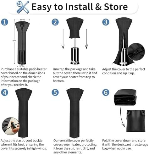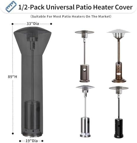 Package Contents: 1 black round 89"H x 33"D x 19"B weatherproof patio heater cover with 1 waterproof storage bag. It works with most brands of heaters on the market today. Please measure your patio heater carefully before purchasing it. Waterproof & UV Resistant Oxford Fabric: Made from 420D durable oxford fabric with an upgraded UV resistant layer, our 100% waterproof outdoor heater cover can withstand a maximum water pressure of 3,000 PA and will stand up well even under high sun exposure, rain, snow and other extreme weather. Strong, lightweight fabrics also ensure the durability and long-term use of heater covers. Durable Zipper Closure & Elastic Draw Cord: With 1 strong full length zipper, this windproof patio propane heater cover is much easier to install and remove. The elastic bottom hem with 2 separate cord locks tightens the cover for a secure fit in high winds. Air mesh vents are designed to promote air flow, prevent condensation, and keep the interior dry. Universal Heater Cover Available in 3 Sizes & 3 Colors: These patio stand up heater covers are available in 3 common sizes and 3 designer colors, as well as 1 or 2 pieces to best match your needs. They are designed to withstand all weather conditions and protect your heater from dust, dirt, and other elements. Easily Store and Care: Comes with 1 portable bag for easy storage when not in use. Our reusable patio heater covers just need to be wiped down with a damp cloth or hose and dried in the sun. It's also machine washable, or you can use cold water by hand. Tumble dry at low heat. DO NOT bleach. Low Temperature Iron.
