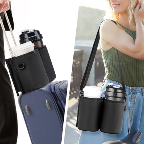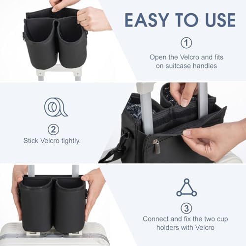 Good Travel Companion :During the journey, have you ever experienced that while pulling the luggage and drinking drinks, the cell phone in your pocket is calling. When you travel with your children or have too much luggage, you don't have time to get a drink. Now our luggage travel cup holder can help you solve your trouble! Upgraded Design Front Cup Holder Bag :Free your hand - In front of the bag can hold two cups, such as coffee cups, juice cups, drinks bottles, your thermos, yeti cups, etc. The interior of each cup holder is made of thermal insulation to keep your drink cool and warm. Can hold bottles up to 3.5 inches in diameter. Back Zipper Pockets :Your mobile phone, passport, cash, travel map or small items can be loaded in the pocket on the back. The back pocket is equipped with zipper to prevent your valuables from falling accidentally on the way. Practical Multifunctional :Just insert the luggage cup holder into the luggage handles and stick the velcro on the inside. It also comes with a shoulder strap, which can also be used as a shoulder bag. The beverage holder side can be placed in the front or back of the luggage. The suitcase cup holder bag is made of high-quality waterproof polyester fiber, foldable and washable. Perfect Gift : It is an ideal gift for people who travel a lot. It is also very suitable for flight attendants, businessmen or parents with children. Free your hands when travel.