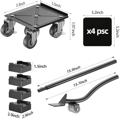 Furniture Dolly Movers: Upgraded version of large panel furniture cart set, including four 5.4 x 5.4-inch 5-wheel carts, 1 pry bar with lock, 4 heightening spacers, 4 flannel anti-slip pads, 1 pair of safety gloves, 1 drawstring storage bag. High quality, no deformation: The heavy-duty cart is made of thickened carbon steel, not easy to deform, reinforced steel base, widened and thickened silent rubber wheels, flexible to move, does not damage the floor, longer carbon steel pry bar can save Physical strength to lift objects easily. Easy to use: Use a crowbar to lift the legs of the furniture. If you need to raise the height, you can raise the cushion pad, then place the mobile cart at the bottom of the furniture and lock the universal wheels. Repeat the above operation to move the four furniture moving wheels. Place it under the furniture, then turn on the universal wheel brake, and you can easily move furniture and other heavy objects without the help of others. New Upgraded Design: The wheeled furniture trolley adopts a larger load-bearing plate and a fifth wheel in the center to increase the load-bearing capacity; L-shaped rib design is not easy to slip during transportation and is equipped with two lock switches , can be fixed at any time, and the anti-pressure handle hook can effectively protect your fingers. Wide range of uses: Furniture carts can be used in homes, companies, parties and other occasions where heavy furniture or appliances (such as refrigerators, washing machines, dryers, toasters, dishwashers, cabinets, stereos, printers, etc.) need to be moved . Other large and heavy objects.