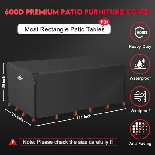| Premium Patio Furniture Cover | - Measures 111" x 74" x 28" (Length x Width x Height), Zettum patio furniture covers are perfectly compatible with most outdoor sofa, table and chair set. This 111 inch patio furniture cover is designed to fit most rectangle patio table with 6 - 10 standard chairs combo or 6 - 8 seater sofa sets, it allows you to cover outdoor furnitures set up to 111"(L) x 74"(W) in size. (Please measure the size of your furniture set carefully!). | 600D Heavy-Duty & Super Waterproof | - Made of Premium 600-Density oxford cloth with PU coating, Zettum outdoor furniture covers are extremely heavy-duty and super waterproof. Compared with PVC type covers, our lawn furniture covers are more breathable and softer, hard to be torn. More importantly, PU-type coating is more environmentally friendly!! | Easy to Put On with Great Protection | - Designed by our patio furniture experts team, Zettum outdoor table covers are very easy to put on and put off. With the cover on your outdoor seating furnitures, no more worry about the sunlight, rain, dust, mist and dirt, etc. Zettum will be the tough protector of your patio furnitures! | Windproof Smart Buckles Design | - Upgrade Quick-Release buckles design make the cover secure to the dining table and chairs set super tightly, No wind can blow away Zettum outdoor furniture table covers! You deserve Zettum patio furniture cover and you will get what you pay for!! Note: Please check the size of the your outdoor furnitures carefully!! | Fading-Resistant Cover for Years | - UV Test can reproduce the damage caused by sunlight, rain, and dew through the equipment. The test shows that Zettum patio furniture cover for outdoor seating can withstand at least 3 years of UV aging, which is much better than others. Thanks to its fading-resistant feature, our 600D lawn furniture covers will protect your outdoor table and chairs for years!