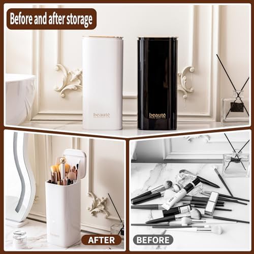 Makeup Brush Holder Organizer, One Touch for Open, Dustproof Make Up Organizer with Lid for Vanity Bathroom Countertop,White