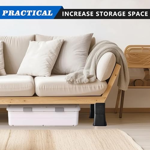 Adjustable Height: Stackable design allows for customizable height adjustments ranging from 1 to 7 inches, catering to individual preferences and specific needs. This versatility creates ample storage space beneath the bed frame and facilitates hassle-free cleaning routines. Universal Compatibility: Featuring an L-shaped lip on two sides and a wide top, our bed risers effortlessly accommodate various furniture legs. The design simplifies installation—just lift the furniture corner and slide the risers underneath for a snug fit. Heavy-Duty Durability: Crafted from high-quality thickened PP plastic, these bed risers boast a robust construction capable of supporting up to 6,000 pounds. Reinforced with internal mesh, they offer exceptional strength and stability, ensuring reliable support for beds, chairs, desks, couch, cabinet and more. Stability and Protection: Equipped with triangular cones on top and rubber pads o bottoms, our furniture risers provide a secure grip on legs, preventing sliding and minimizing noise. The shock-absorbing design protects floors from damage due to friction, offering peace of mind and maintaining a stable environment. Versatile Solution: Not only do these risers optimize storage space, but they also contribute to better sleep quality and assist individuals with mobility challenges. Whether raising low furniture to aid in sitting or standing, our risers offer a convenient and effective solution for enhancing comfort and accessibility.