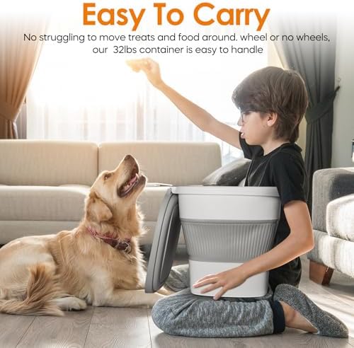 【Note】: Due to the varying sizes of pet food kibbles, the overall size of the pet food storage container may differ. The largest capacity can accommodate up to 35 lbs of pet food. 【Multipurpose Storage】: This essential pet food storage container is perfect for storing dog food, cat food, or other pet foods. It is suitable for holding approximately 35 pounds of dry pet food. 【Space Save & Extra-large Size】: This dog food bin can hold 35 lbs of rice or pet food. Unfolded size:17.64"L x 11.14"W x 12.5"H, suitable for storing 35 pounds of rice or 23 pounds of dog food. Folded size:17.64"L x 11.14"W x 5.75"H, can hold about 15pounds rice or 13 pounds of dog or cat food 【Airtight pet food storage container】This airtight pet food container is perfect for storing dog or cat food and other pet food. It can keep food fresh and flavorful. 【Built-in detachable wheels】: Our airtight dog food storage container is not heavy and has been carefully designed with 4 detachable rollers that make it easy to move from one place to another 【What else you get】: The container for dog food comes with 1 pet food spoon and 1 small container to feed your adorable pet perfectly according to his needs.