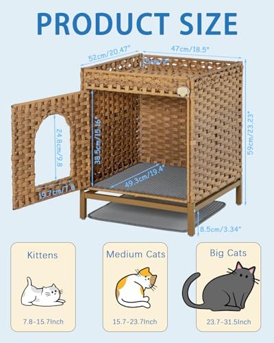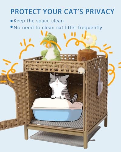[Litter Box with Cat Litter Mat]: The hidden litter box is equipped with a cat litter mat. The upper mat can filter large particles, the lower mat collects fallen cat litter. There is no litter left in the cat box enclosure and it's easy to clean up [Easy daily cleaning]: Cat litter box furniture hidden with 3.34" height metal heightening feet can pass through most robot vacuum, cleaning without burden. Cat litter furniture hidden equipped with 2 S-shaped hooks, can hang cat litter shovels or others [Comfortable Space]: The enclosed litter box furniture is hand-woven from rattan material, which is not afraid of sunlight - which is both light-transmitting, effectively blocks disturbing odors, making your cat and you more comfortable to get along with [Multifunction]: The internal space size of 16.1”L x 19.4”W x 15.16”H can accommodate most cat litter boxes. Cat litter box enclosure furniture can also be used as a cat house. Hidden litter box furniture has a 2" fence on the top to store the cat stuff [Easy to use and install]: The door lock of cat furniture litter box with a cute cat head image can easily rotate to open the door. The double doors make it easier to clean the cat litter box, and cat litter box hidden assembly is easy